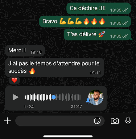 Échanges quotidiens sur WhatsApp et entraide en continu.